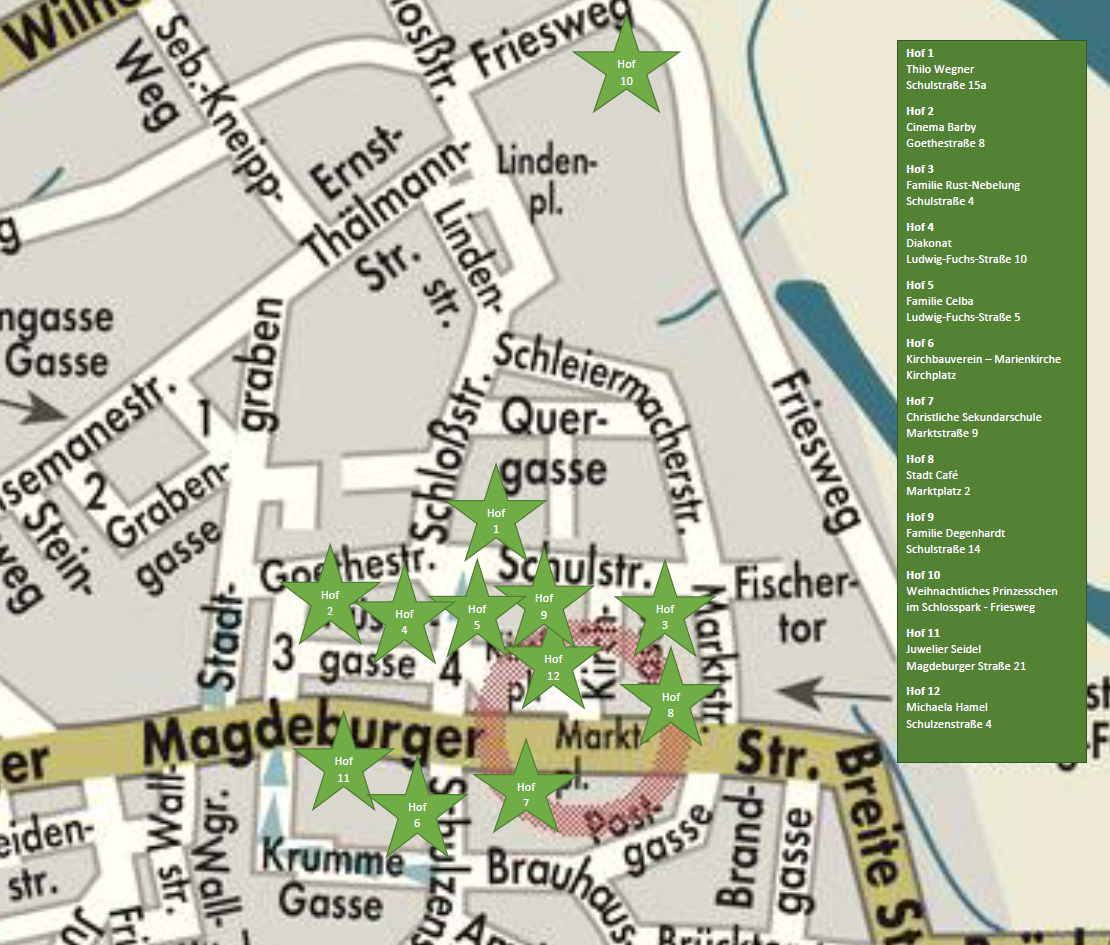 Erstmals mit einem eigenen Hof dabei ist die Evangelische Kirchengemeinde Barby. Auf die Besucher warten Stockbrot, Gebäck, Früchtepunsch und Glühwein sowie Kreativangebote für Kinder.