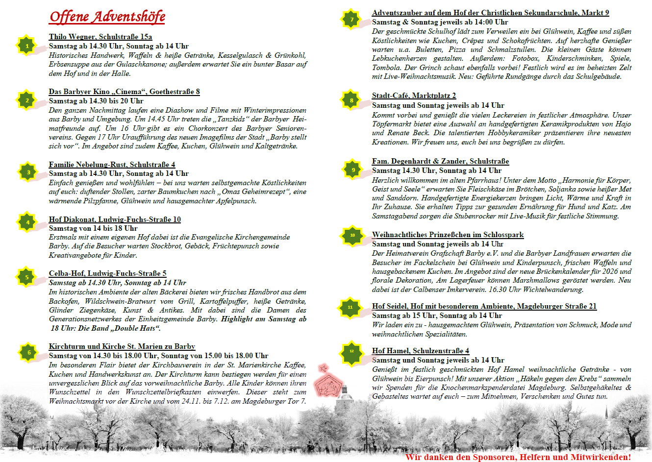 Unsere auswärtigen Gäste bitten wir, die öffentlichen Parkplätze u.a. am Magdeburger Tor, in der Schloßstraße (Johanniskirche), am Friesweg (Grundschule) sowie die straßenbegleitenden Parkflächen u.a. in der Schleiermacherstraße zu nutzen.